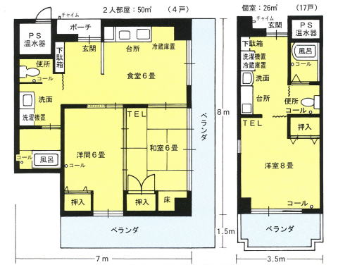 【共用】食堂、談話娯楽室、エレベーター、消火・避難設備、一斉放送設備、相談室、事務室、来客用室(宿泊可)、当直室、自動販売機、売店、大衆浴場