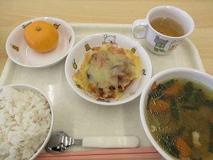 当園では株式会社メフォスに給食を委託しています。1962年から続く給食に特化した企業で、保育施設、学校、老人ホームなどに「食」を提供している、信頼のある会社です。当園にある給食室にて毎日おいしい給食を作ってくれています。手作りにこだわっているため、おやつも市販のものではなく一から作っています。月に一度は特別メニューがあり、地元の特産を生かした給食が提供されます。「こめから」や「さけかすなべ」、「西条柿のプリン」など、食を通して地域に触れることができ、子ども達も喜んで食べていますよ。食物アレルギーにも対応しており、代替食や除去食を提供しています。ノウハウがしっかりしており、食物アレルギーをもつお子さまも安心して預けることができます。